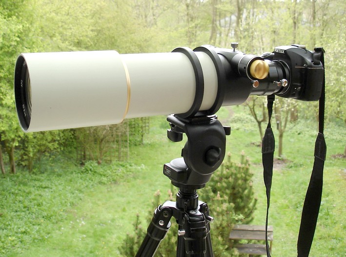 © Digiscopie.info Une lunette astronomique peut s'accoupler à une boîtier reflex et faire office de super-téléobjectif. C'est le principe de base de la reflexoscopie. |