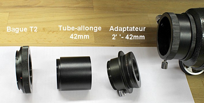 Le raccordement de la lunette au reflex.D’un côté, vous avez votre boîtier reflex, avec la baïonnette typique de la marque, et parfois du modèle. De l’autre côté, vous avez votre lunette qui se termine par une ouverture de 2 pouces de diamètre et qui a été conçue pour observer des objets éloignés de milliards de km. Il faut maintenant raccorder les deux et s’assurer que l’on pourra faire la mise au point à une distance de quelques mètres. La nécessité de base est de passer d'un coulant de 2 pouces à un pas de vis de 42 mm, tout en augmentant le tirage pour permettre une mise au point plus proche. Diverses combinaisons sont possibles. |